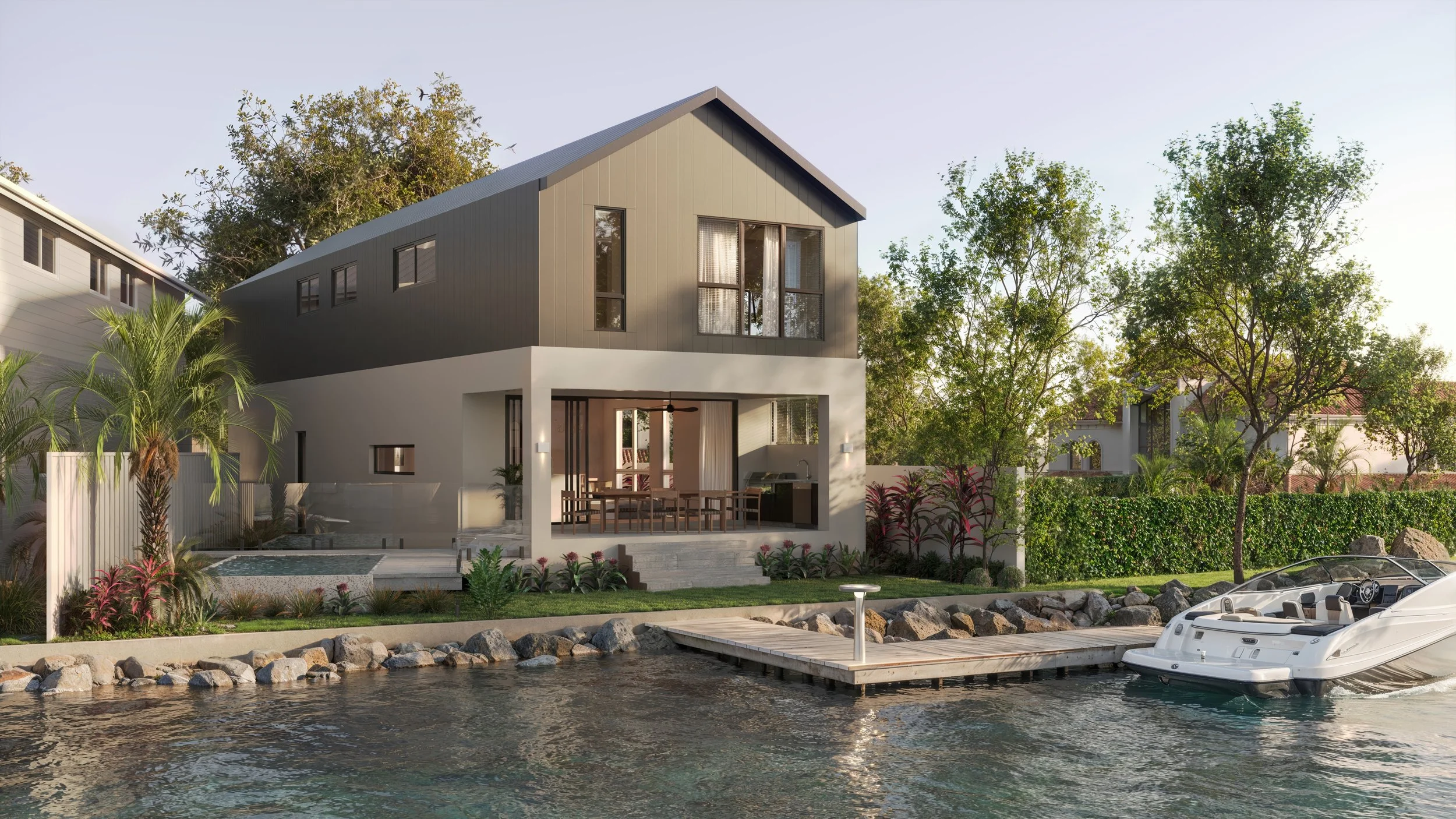 With direct access to the water via your own jetty, weekend boating, sunset drinks, and slow mornings are a part of everyday life. This sensational home is where contemporary, sophisticated design meets effortless waterfront living — a refined yet grounded retreat with real impact.